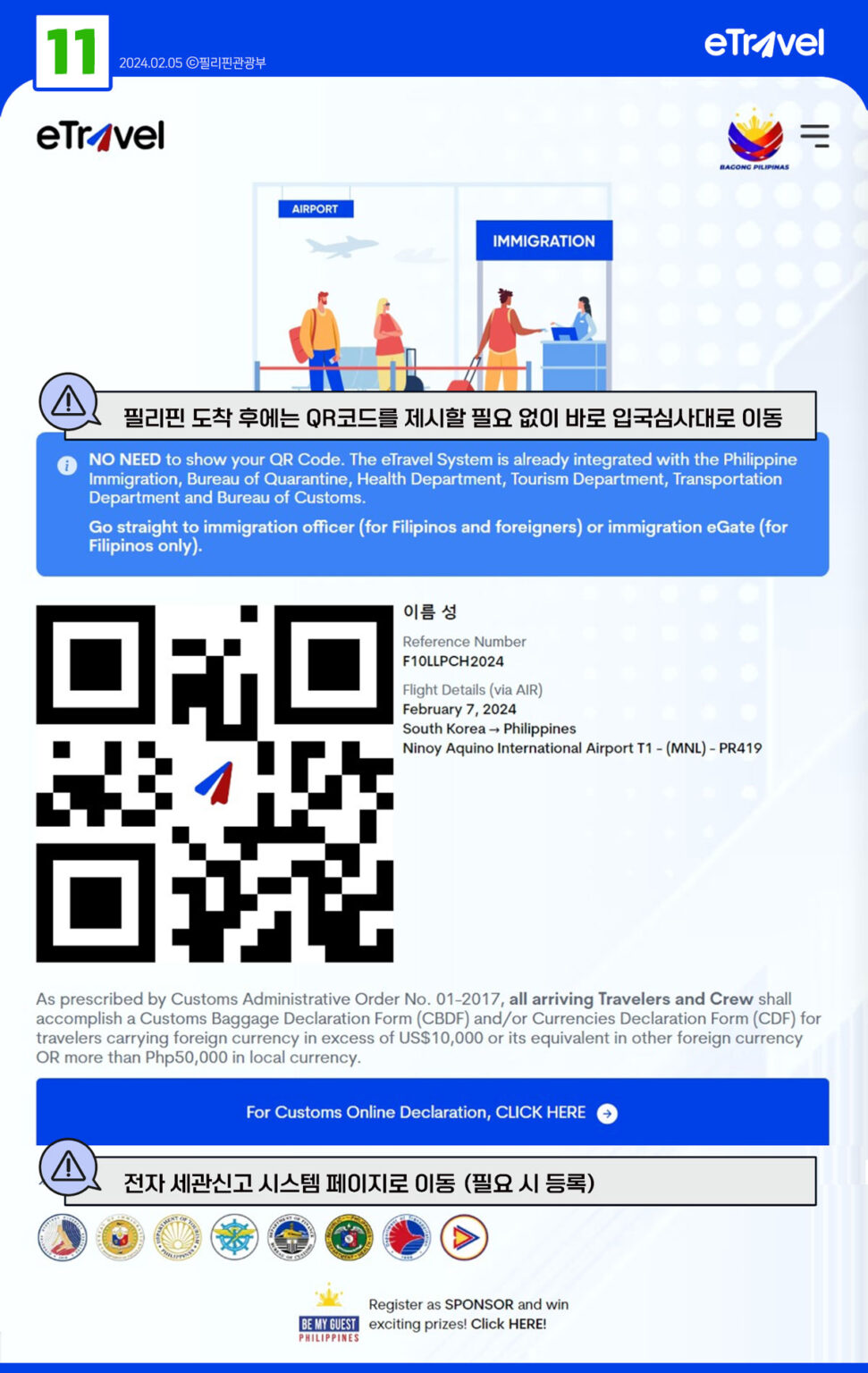 여행자들은 필리핀에 입국하기 전에 반드시 eTravel 등록을 완료해야 하며, 이는 QR 코드 발급을 통해 공항에서 신속한 입국 처리를 가능하게 합니다.
